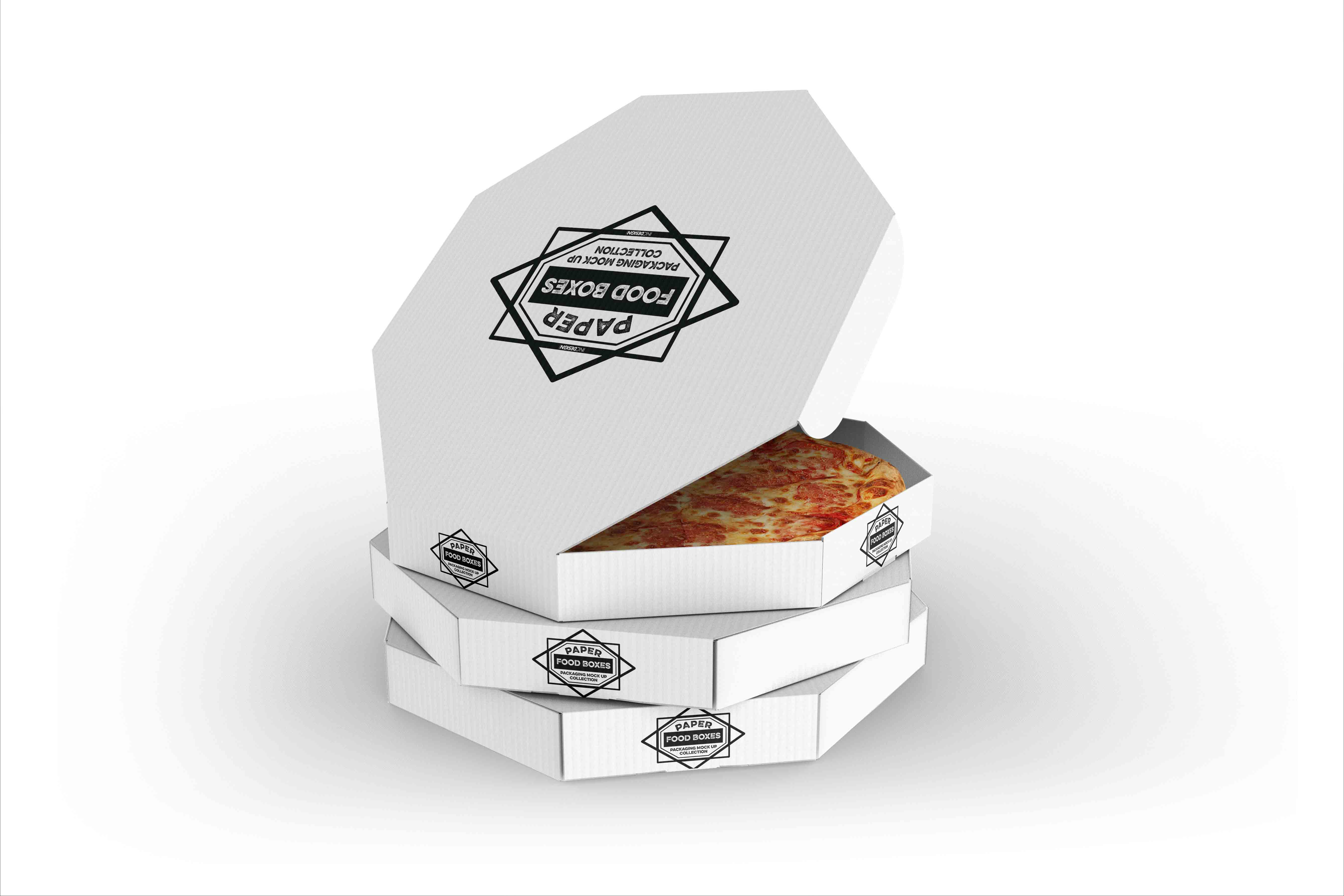 适合餐饮品牌包装设计,翻盖盒结构便捷实用,轻松替换贴图,展示披萨包装效果。